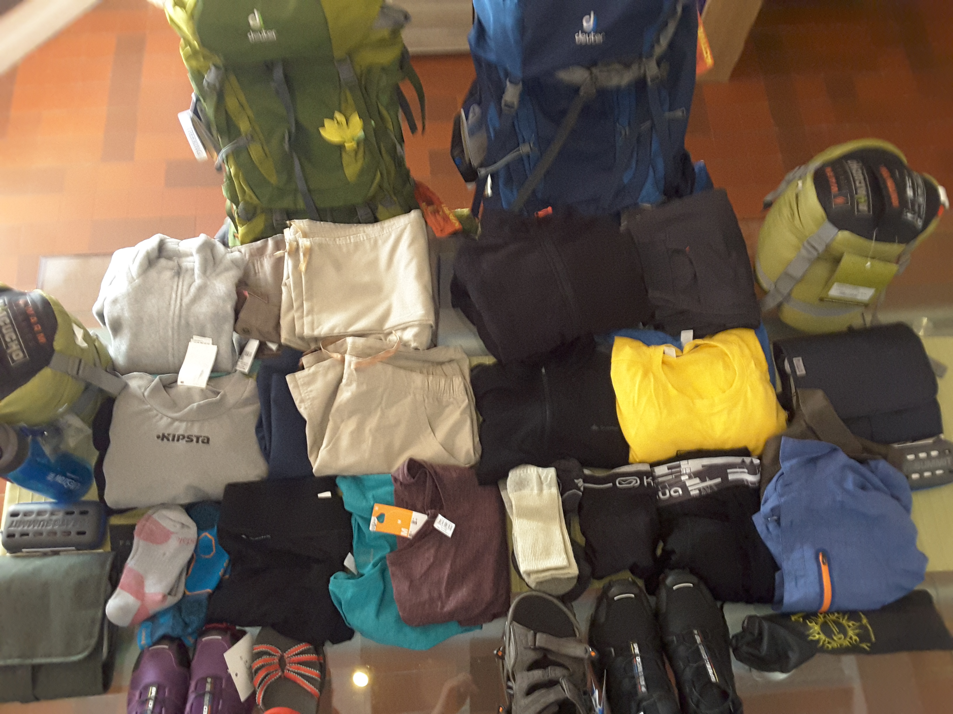 Bon d’accord, je vais m’attarder un peu plus sur ce sujet. Même si nous n’avons pas encore tout et qu’il y aura sûrement encore des changements à apporter d’ici notre départ. Voici nos affaires pour un périple de quelques mois en Amérique du Sud.