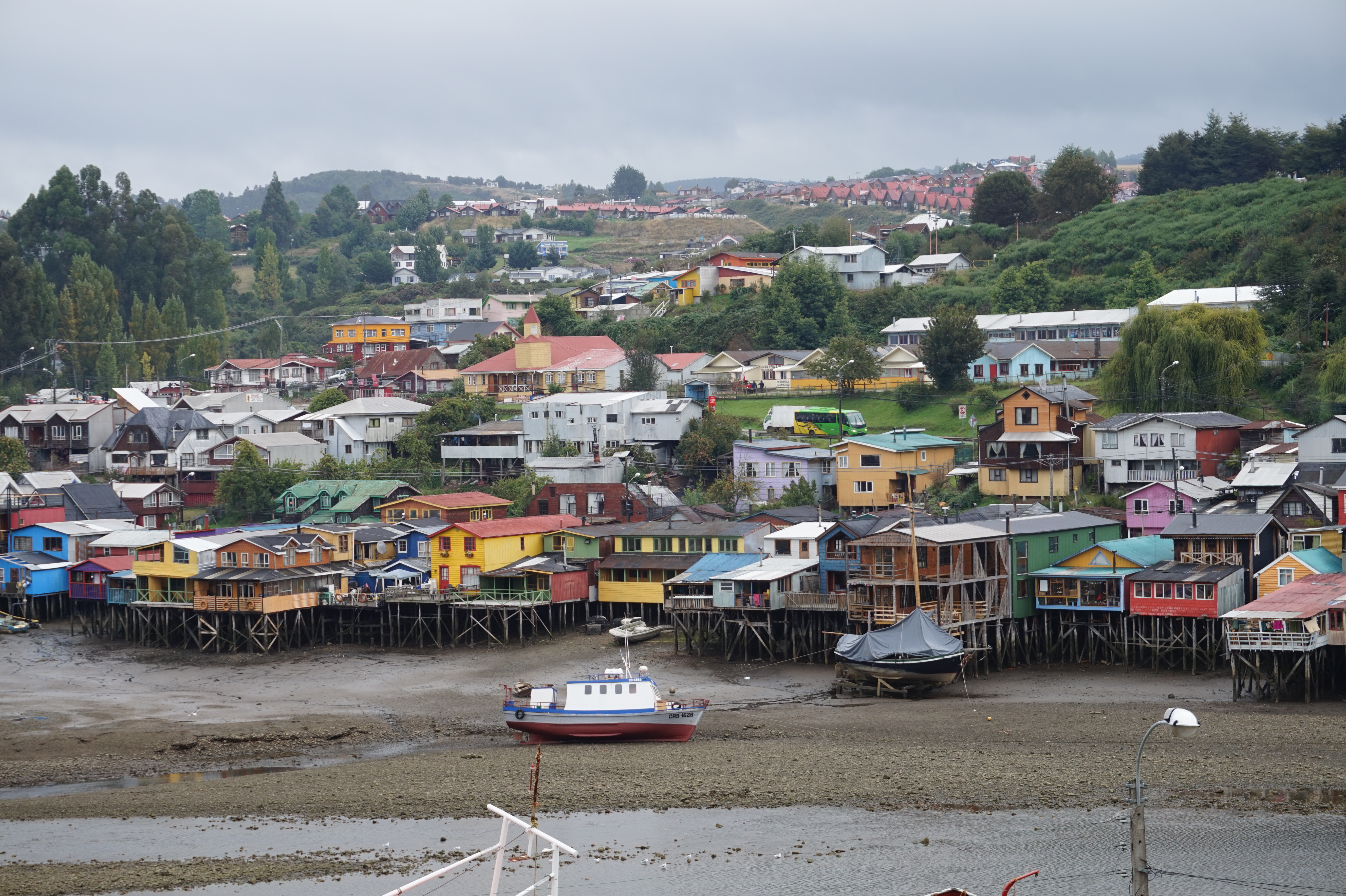 Bref, nous voilà à Castro capitale de l’île de Chiloé, petite ville vraiment attrayante, installée dans une jolie crique où on y retrouve des styles d’architectures assez différents, dont celui des palafitos. Notre hostal « La Oveja » que j’avais vite repéré sur l’application Maps.me nous a parfaitement satisfaits.