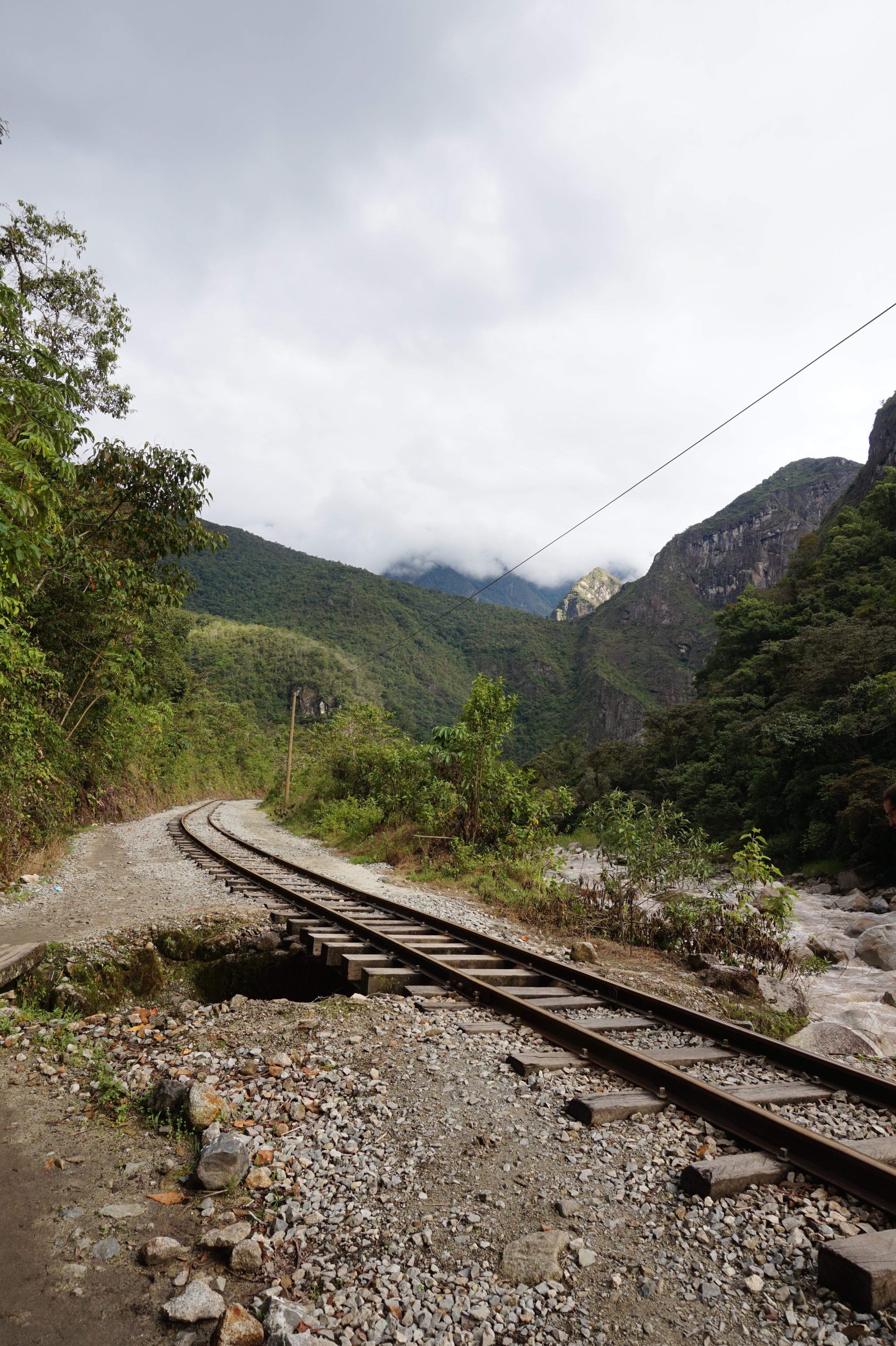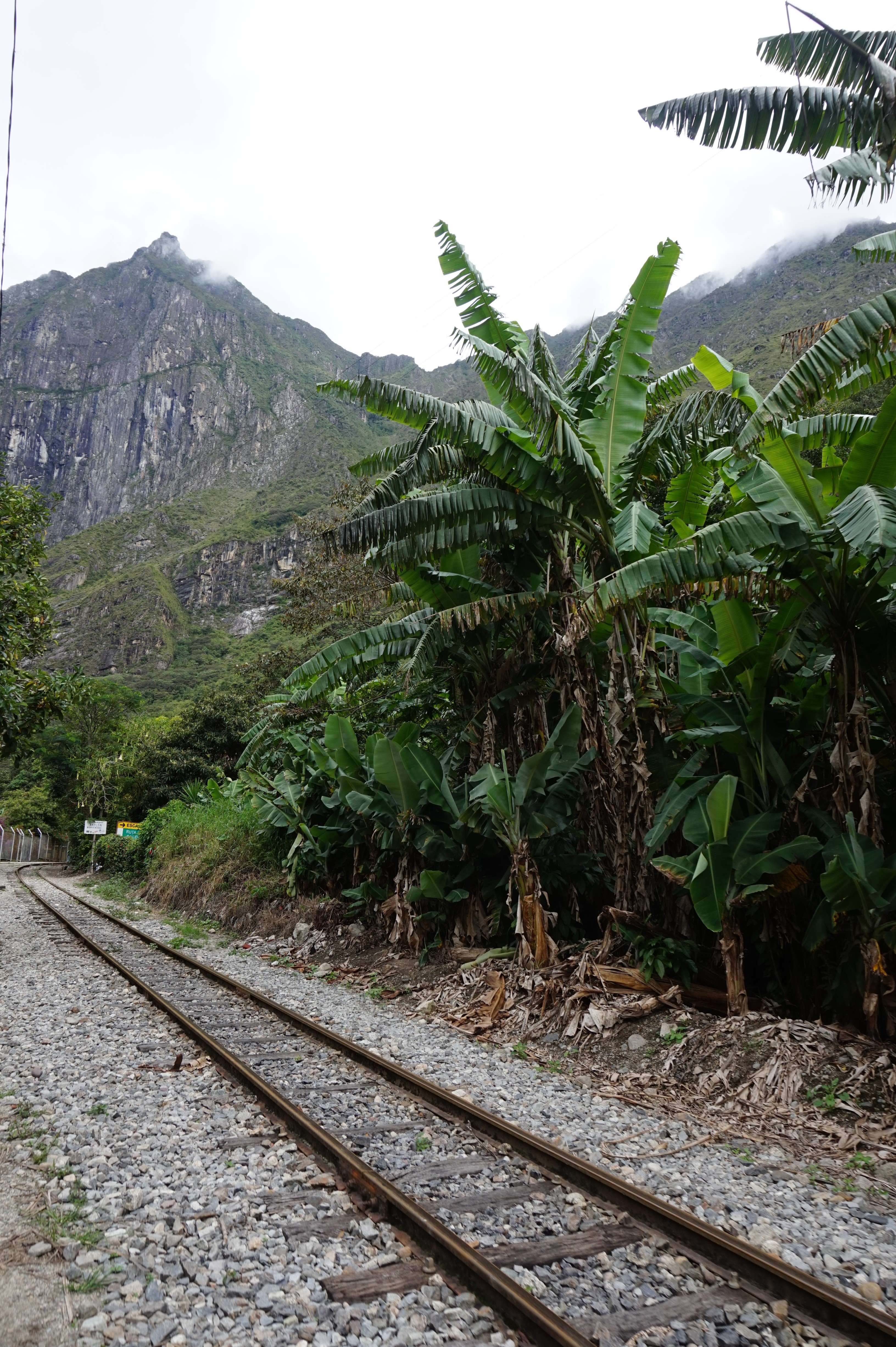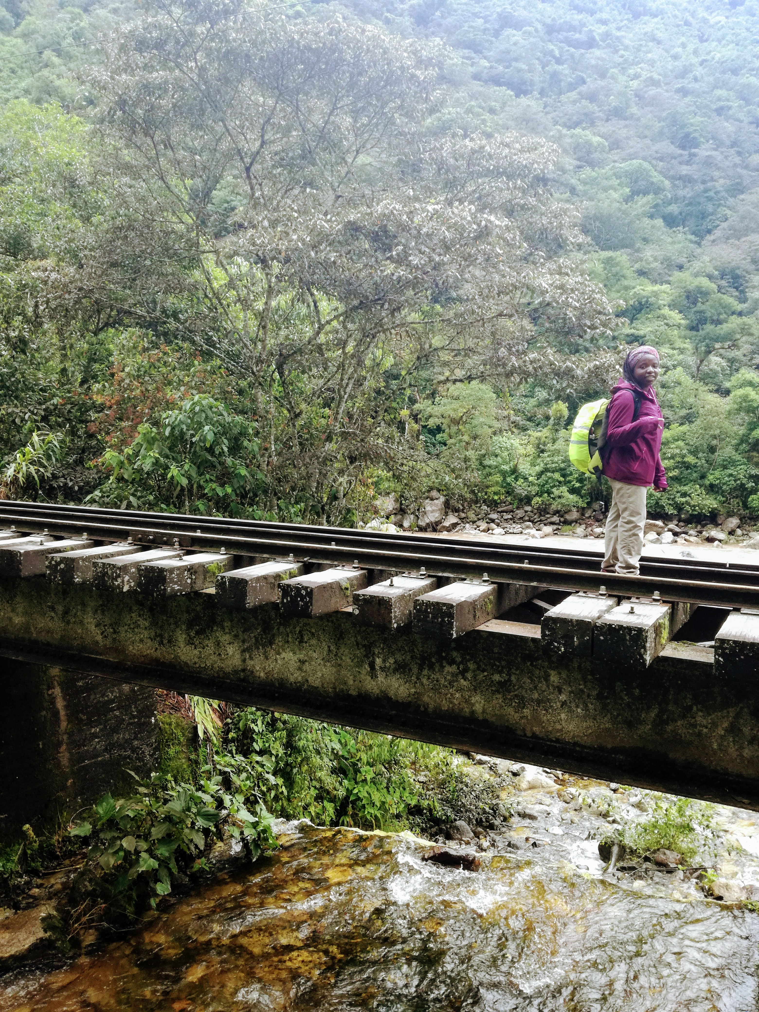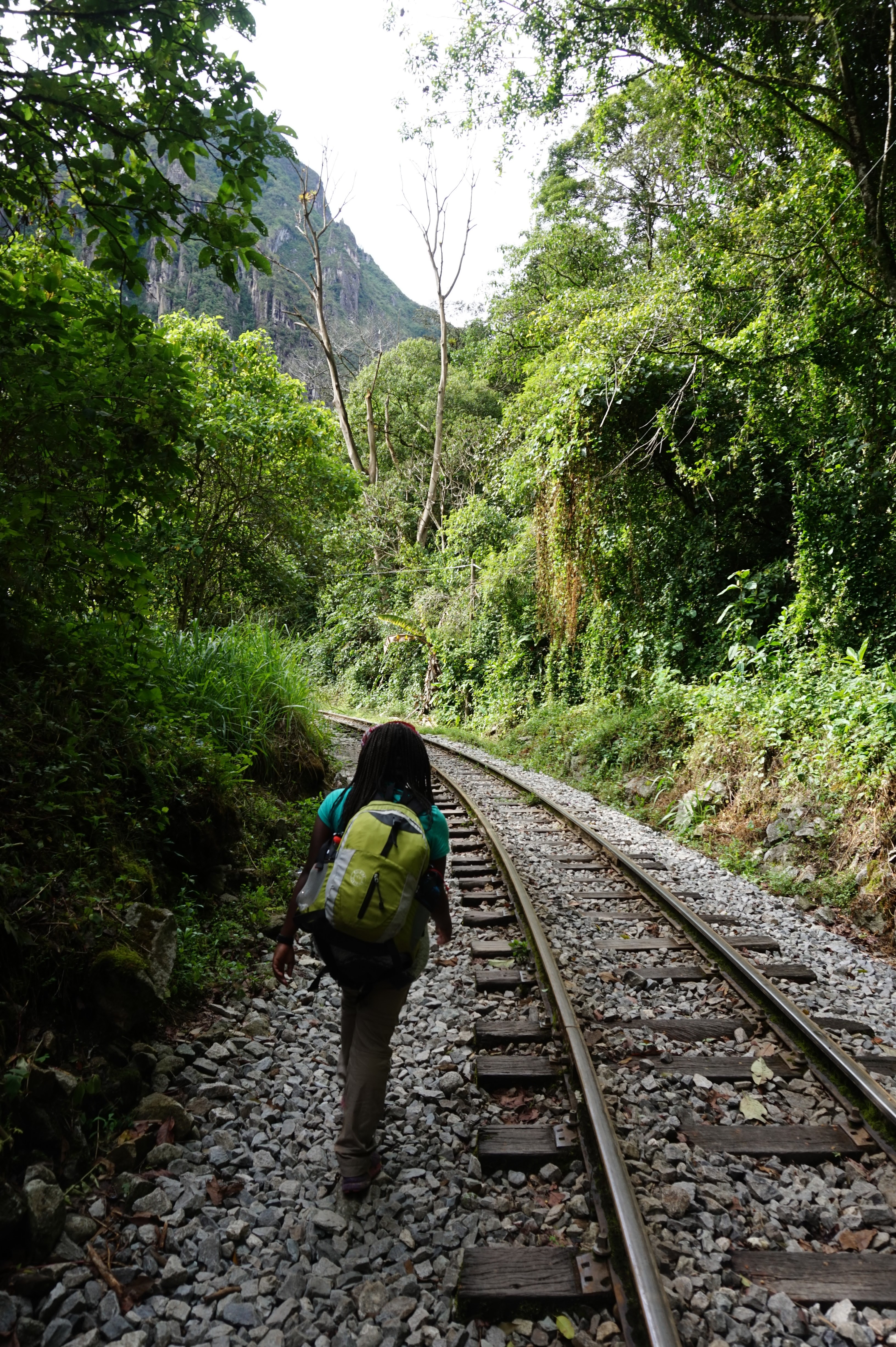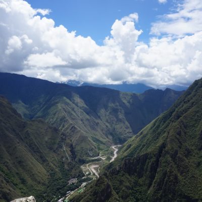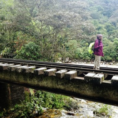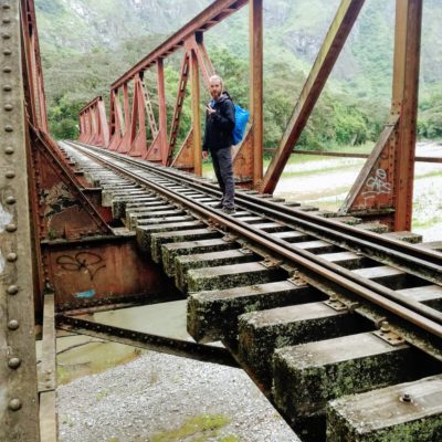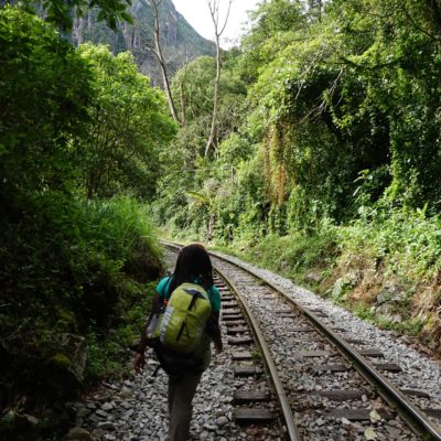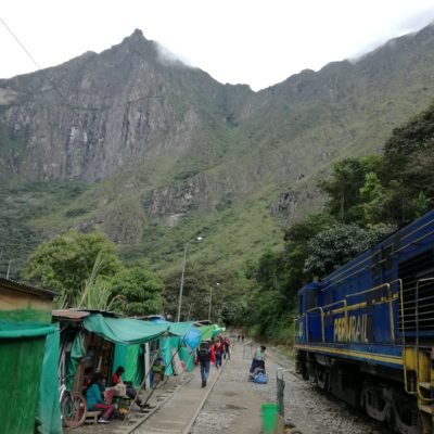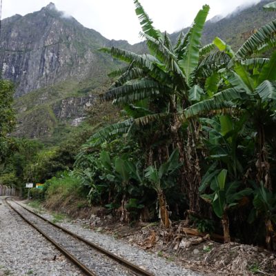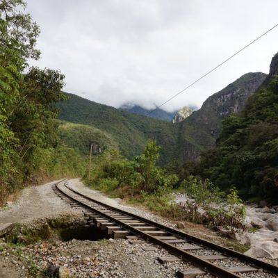 Nous sommes jeudi 29 décembre, il est 7h30 quand nous nous mettons en route en combi pour 7h30–8h de trajet (compter 70 soles pour l’aller-retour en combi jusqu’à Hydroélectrica, contre minimum 80 dollars juste pour un aller en train :-)) sur des petites routes de montagnes avec un chauffeur qui à passé la majorité du son temps au téléphone, ce qui a provoqué une petite frayeur quand on est passé très proche d’un ravin suite à un croisement avec une autre voiture. Des beaux paysages d’accord mais serré comme des sardines en boite et secoué dans tous les sens. Il est 14h30′ quand nous arrivons à Hydroélectrica, le temps est clément, nous mangeons un petit bout et prenons la route pour cette fois-ci 2h30′ de marche le long de la voie ferrée, entouré de montagnes et de paysages magnifiques,