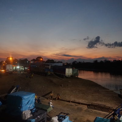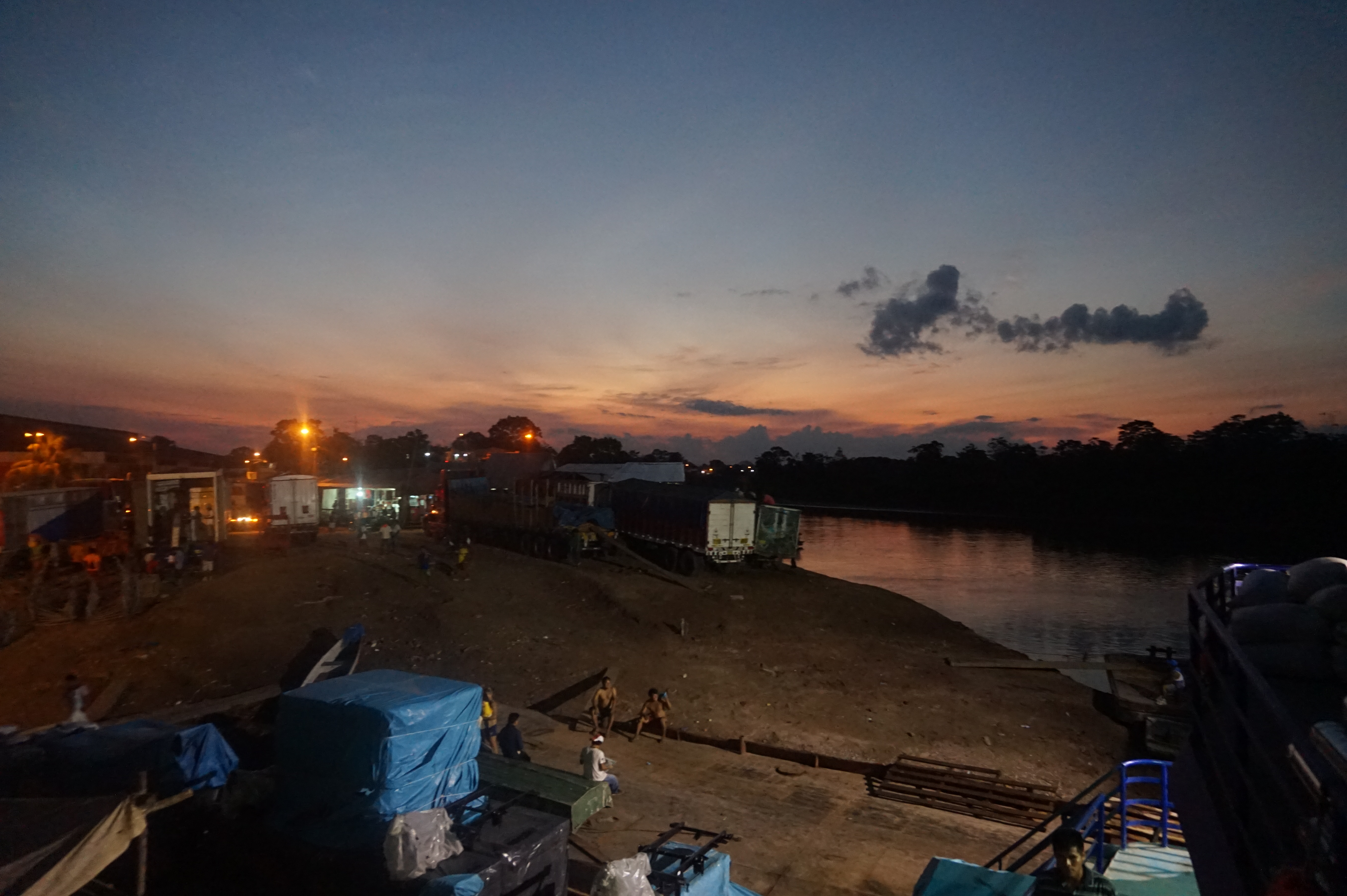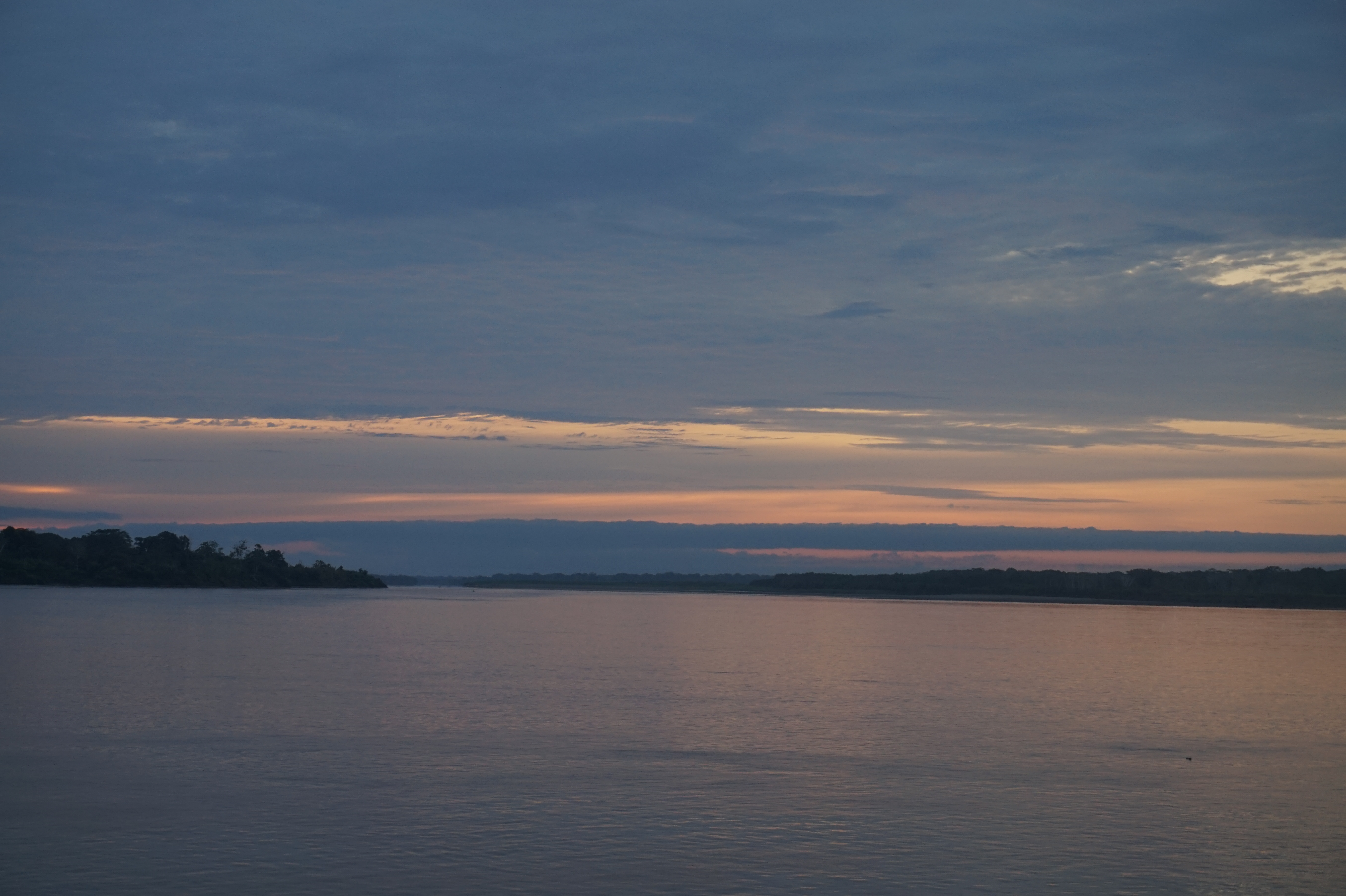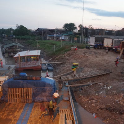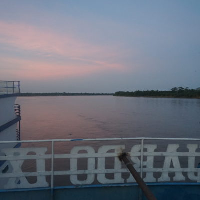 Après un début de soirée à regarder les travailleurs charger les marchandises et maltraiter le bétail pour les faire grimper sur un autre cargo, notre bateau prend le large direction l’Amazonie.