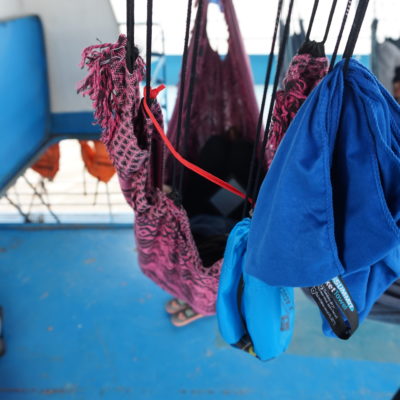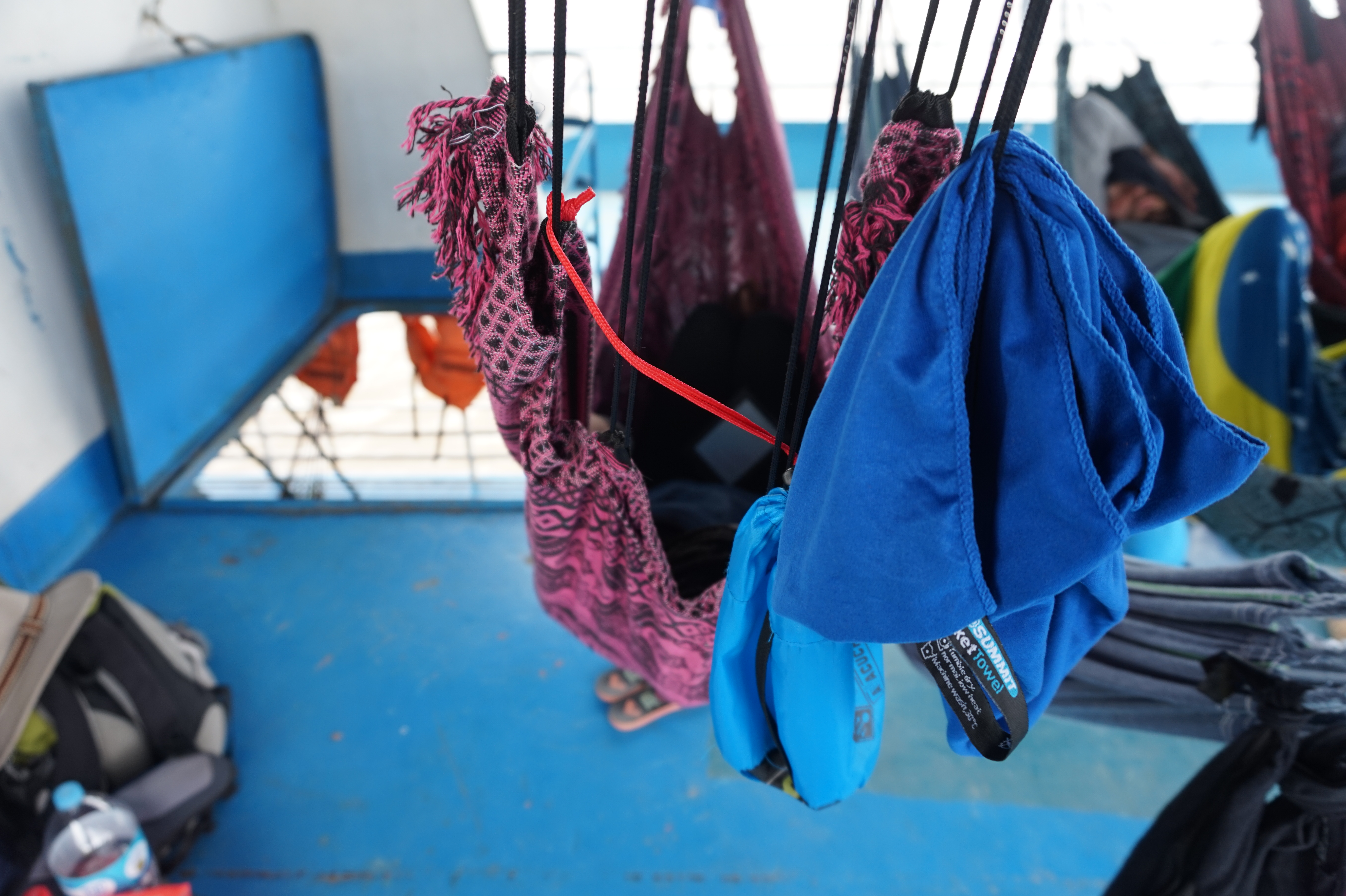 Après quelques achats de provisions et de deux hamacs dans l’après-midi, nous voici donc sur le pont supérieur, en compagnie de 4 allemands et une Québécoise parés pour la traversée de 3 jours en bateau.